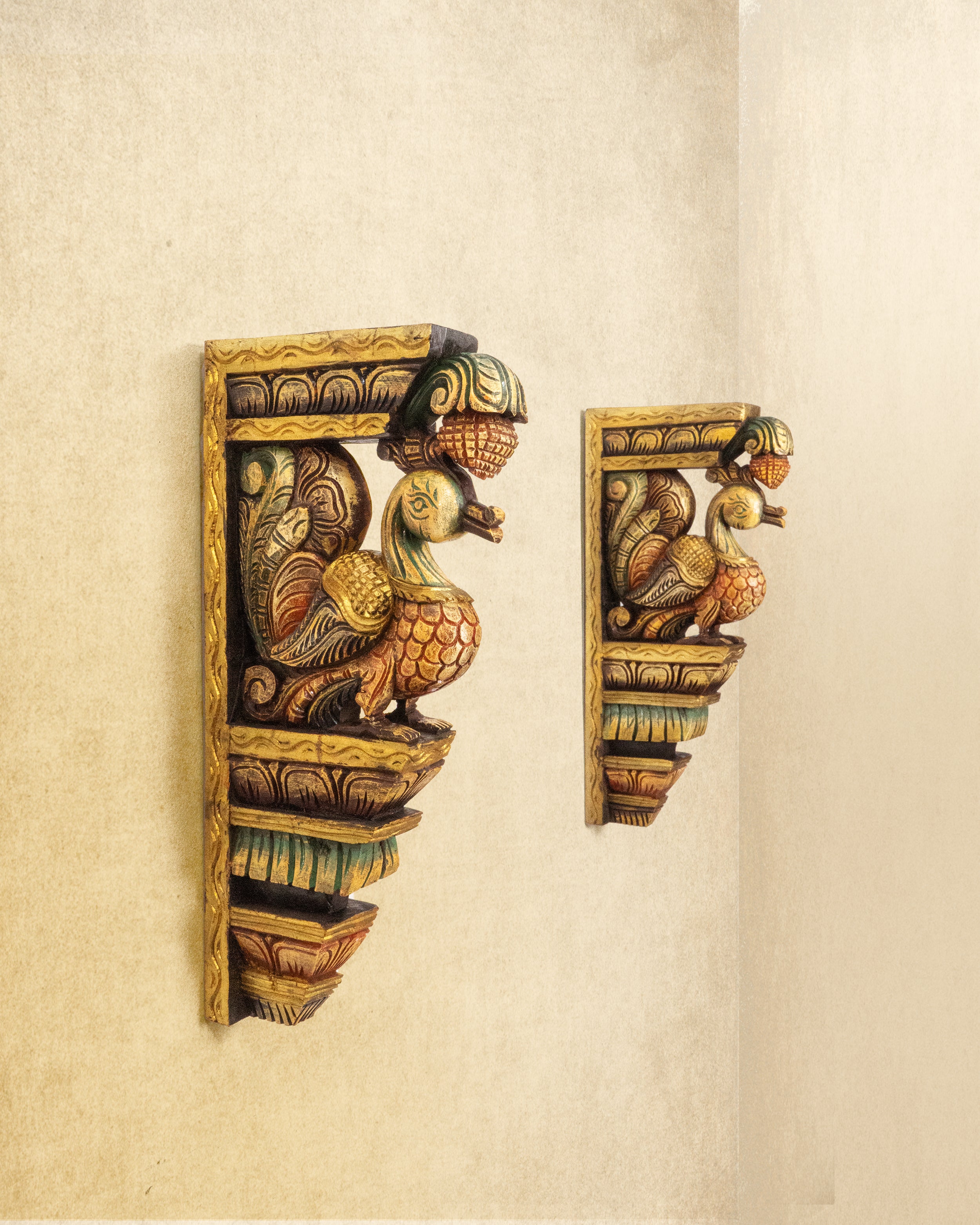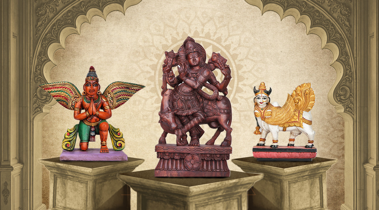 Master-crafted idols finished by 4th-generation artisans and coloured by skilled women. Custom woods—Vaagai, Mahogany, Teak—and finishes in Natural, Rosewood or Antique. Each piece supports South Indian art.